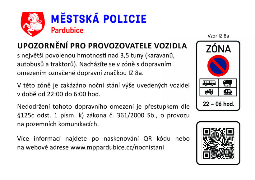 Městská policie Pardubice upozorňuje řidiče a provozovatele vozidel s největší povolenou hmotností nad 3,5 tuny, stejně jako autobusů, traktorů a karavanů, na platná dopravní omezení na území statutárního města Pardubice. V oblasti označené dopravní značkou "IZ 8a – Zóna s dopravním omezením" nesmějí tato vozidla stát přes noc, tedy od 22.00 do 6.00 hodin.