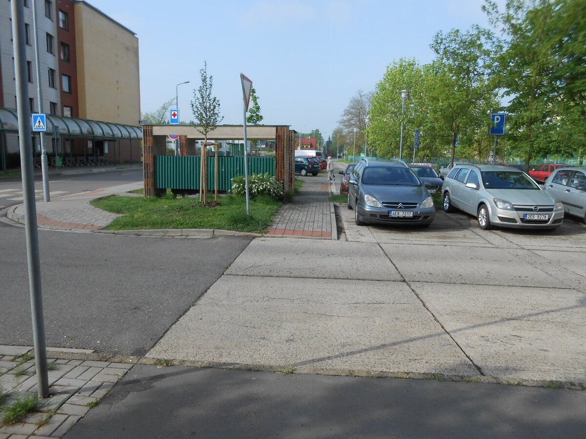 V prostoru před trafostanicí u čp. 1004 je manipulační plocha ze zatravňovacích tvárnic tl. 80 mm do podkladu ze štěrkodrti v tl. 150 mm. Plocha je upnuta vůči vozovce do zvýšené úrovně +10 cm. V tomto prostoru ve stávajícím stavu parkují vozidla, na základě vyjádření ČEZ s ohledem na bezpečnostní pásma zařízení ČEZ. Nyní je parkování před objektem trafostanice zakázáno.
