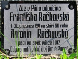 Hrob se nachází na centrálním hřbitově v Pardubicích. Je zatravněný, lemovaný pískovcovou obrubou. V záhlaví je pomník z teracca, ve spodní části urnový prostor, na něm deska s přesahujícím překladem s nápisem „Rodina Račkovských“. Na desce pod překladem bronzový odlitek hlavy Krista z profilu, pod ním pamětní deska z černého opaxitu s pozitivně vybroušeným nápisem. Deska je uvolněná, opřená o památník. Po stranách desky jsou nestejně vysoké stojánky na květiny. Nápis na desce zní: „Antonín Račkovský / padl ve svět. válce 1917“. Antonín Račkovský padl na italské frontě dne 21. 4. 1917, pochován byl 24. 4. 1917 na hřbitově v Janianě.