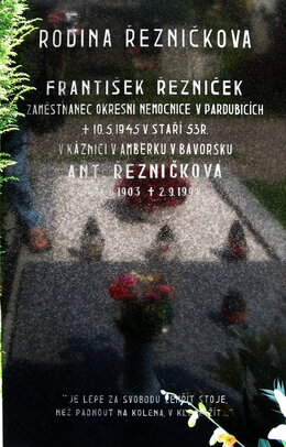 Rodinná hrobka s žulovou obrubou, krytá deskami, se nachází na hřbitově v Pardubičkách. Pomník je složen ze dvou desek: levá z černé leštěné žuly a sekaným nápisem zvýrazněným bílou barvou, pravá vyšší ze světlé žuly označená bronzovým křížem. Nápis zní: „František Řezníček / zaměstnanec okresní nemocnice v Pardubicích / + 10.5.1945 v stáří 53 r. / v káznici v Amberku v Bavorsku“. V dolní části text: „Je lépe za svobodu zemřít stoje, / než padnout na kolena, v kleče žít …“. František Řezníček, nar. 20.1.1892 v Chacholicích, byl zatčen 23.8.1944 za poslech zahraničního rozhlasu, vězněn v Praze, Terezíně a Amberku. Zemřel 10.5.1945 po návratu z vězení.