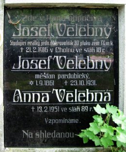Rodinný hrob obroubený teracovou obrubou, zakrytý betonovou deskou. Pomník v záhlaví hrobu vyzdívaný v kubistickém duchu, opatřený tvrdou cementovou omítkou. V nice pomníku osazena pamětní deska příslušníků rodiny Velebných z leštěné černé žuly s rytým nápisem zvýrazněným bílou barvou. Text zní: "Josef Velebný / studující reálky, jedn. dobrovolník 30 pluku zem. 14 m.k. / + 21. 2. 1916 v Cholnu, ve stáří 18 r. "