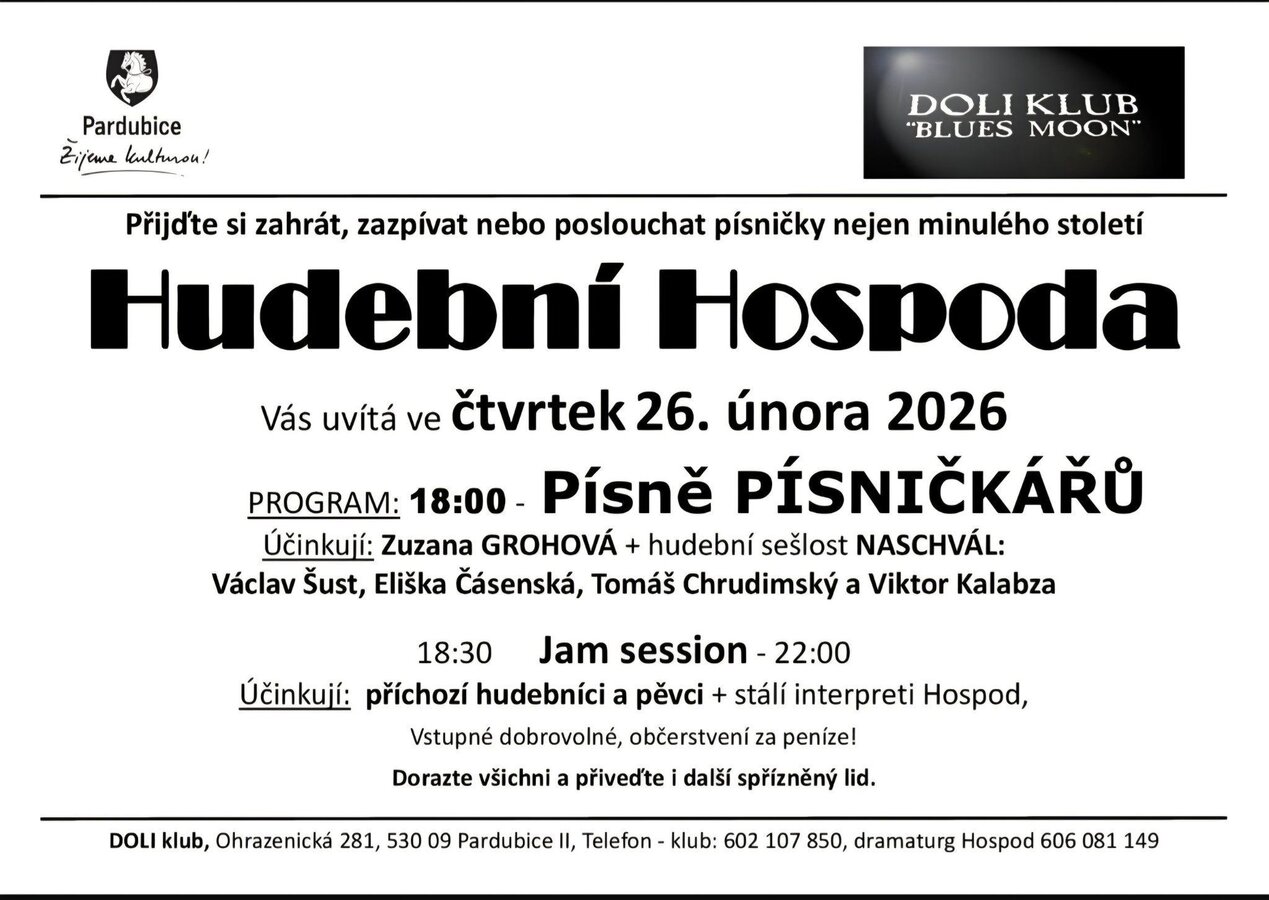 Kalendář akcí Hudební hospoda Doli Klub - Ohrazenická 281 Pardubice hudba Čt 26. 2. 2026 18:00 Čt 26. 3. 2026 18:00 Popis akce Zveme Vás na jam session do pardubického Doli klubu. Fotogalerie