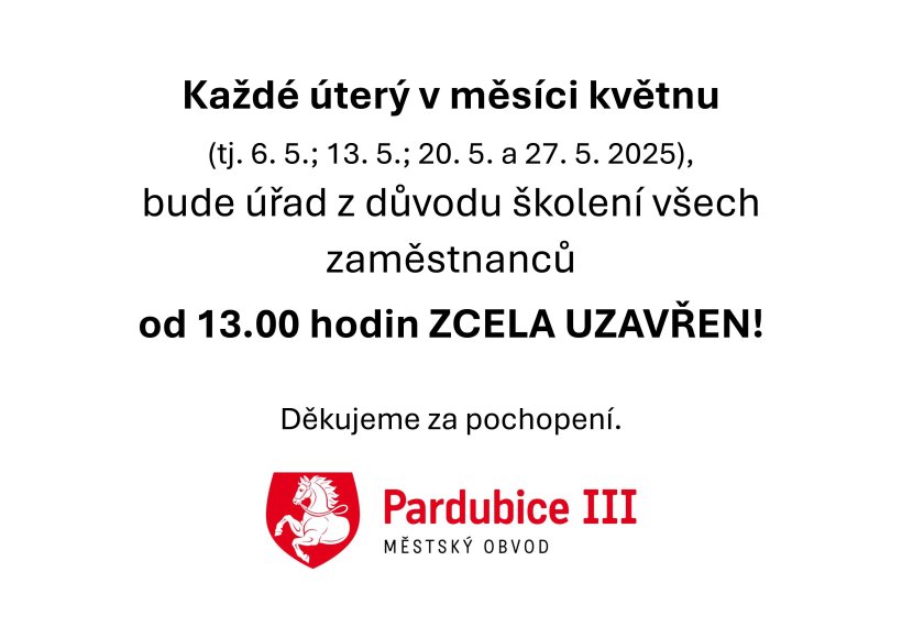Aktuality Každé úterý v měsíci květnu bude úřad odpoledne uzavřen! Úterý od 13.00 hodin bude zavřeno: 6. 5.; 13. 5.; 20. 5. a 27. 5. 2025