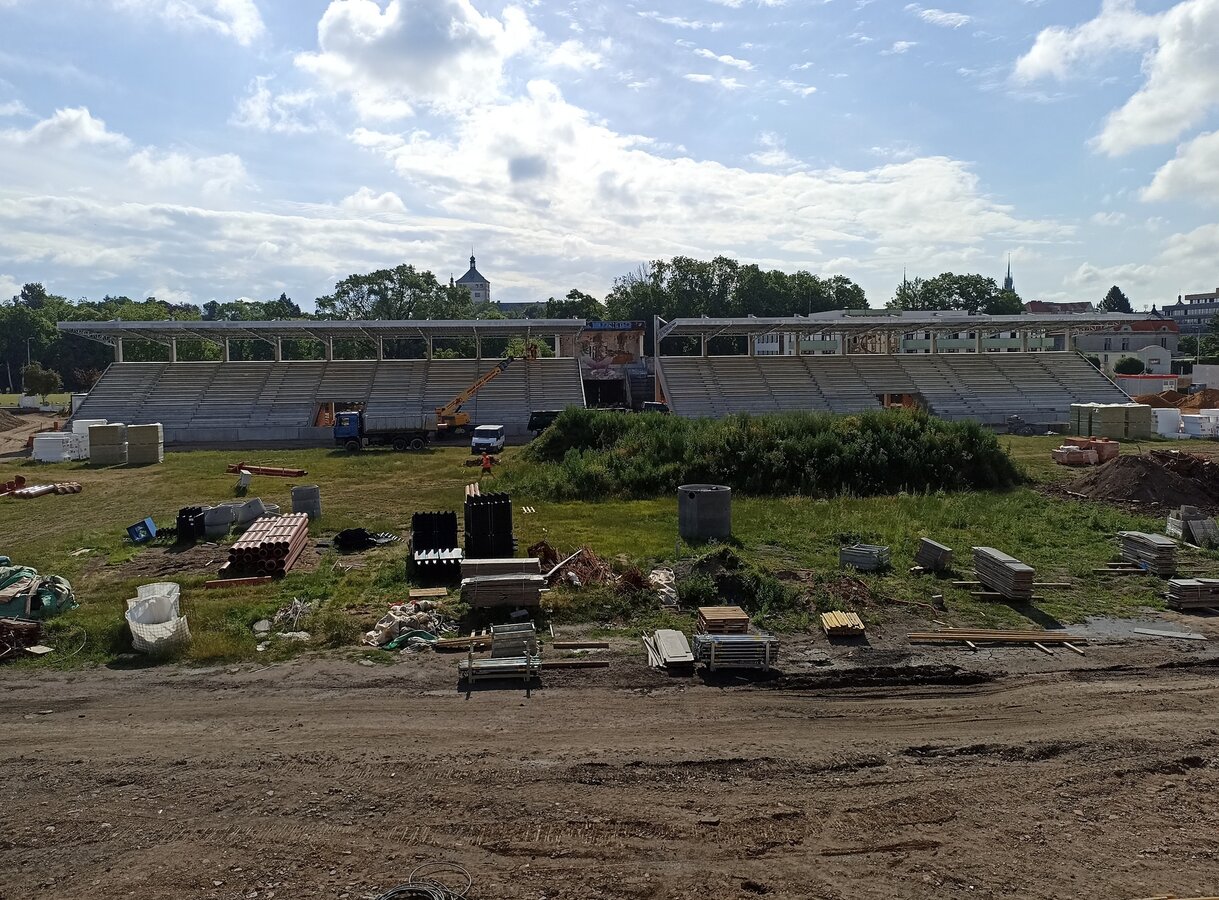 Rekonstrukce letního stadionu se posouvá do další etapy. Hrubá stavba hlavní tribuny, která patří mezi památkově chráněné objekty, byla dokončena již začátkem června, v případě dalších tribun se již provádí práce na jejich osvětlení. Od srpna by se stavbaři měli pustit do pokládky trávníku, který z této plochy udělá ten pravý fotbalový stadion.