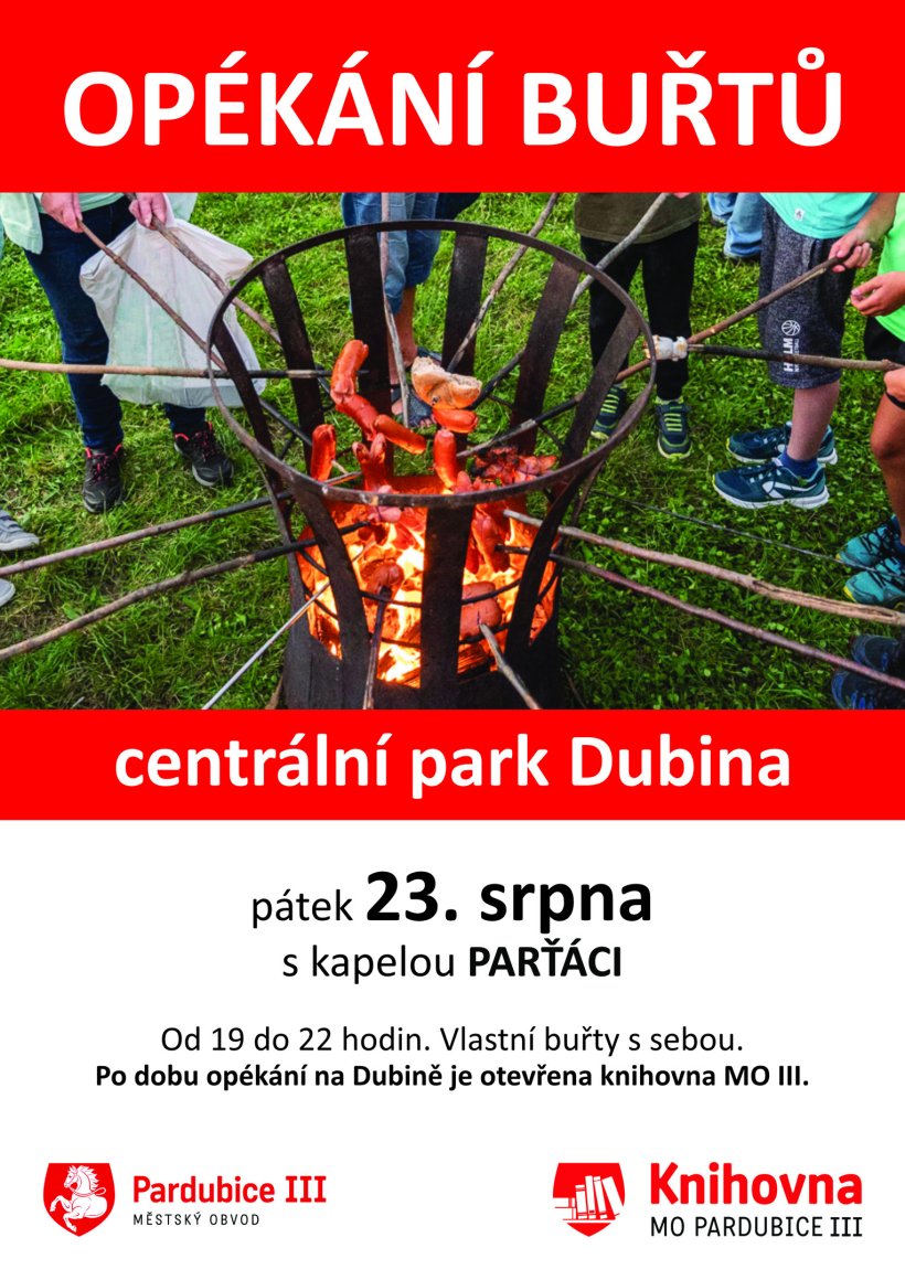 Aktuality Opékání buřtů na Dubině - 23. 8. 2024 centrální park Dubina / kapela PARŤÁCI / od 19 do 22 hodin / vlastní buřty s sebou