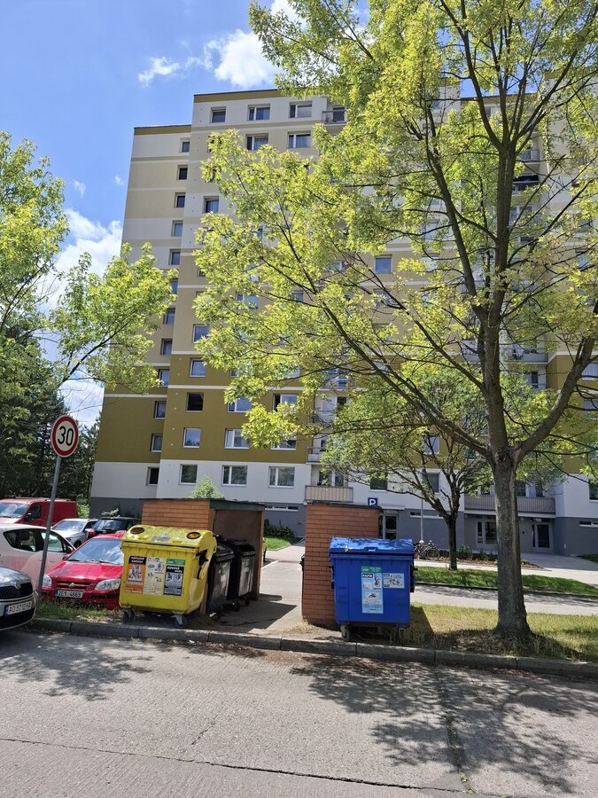 - Kontejnerový přístřešek je pevně ohraničen ze 3 stran, není průchozí a je přístupný 2 vstupy šíře 1,480 m ve směru od parkoviště.