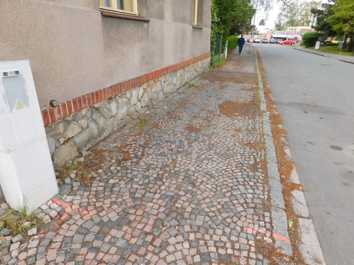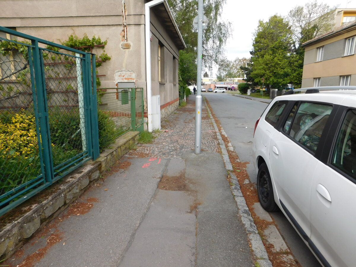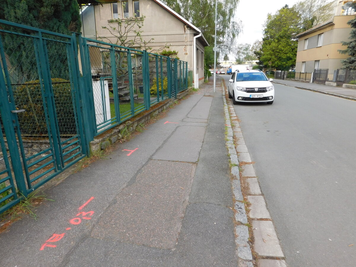 Předmětem objednávky byla oprava stávajícího podélného chodníku s povrchem ze žulové mozaiky a asfaltovým povrchem spočívající ve výměně krytu a konstrukčních vrstev. Stávající žulové obrubníky KS 3 a betonové vodící pásky byly zachovány. Výměna byla provedena pouze na poškozených a na rozbitých místech. U stávajících vjezdů byly sníženy obruby a osazena hmatná dlažba Klasiko červené barvy pro nevidomé. Na začátku úseku od ulice Na Drážce byl osazen betonový chodníkový obrubník v délce 33,5 m. Odvodnění zpevněných ploch je do komunikace.