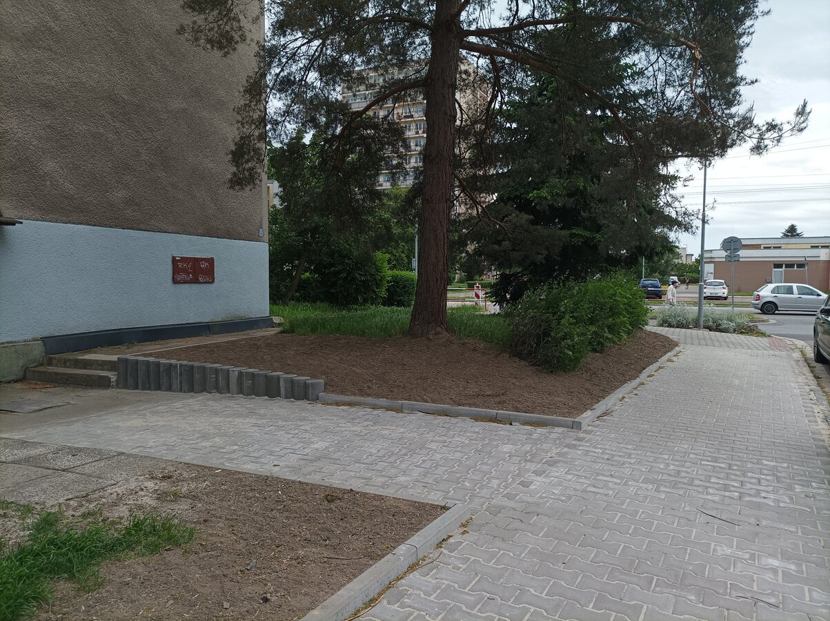 Z důvodu snížení nevyužívaných betonových ploch a zajištění bezbariérového napojení přístupového chodníku k bočnímu vchodu k čp. 1535 byla provedena oprava přístupového chodníku k bočnímu vchodu k čp. 1535. Stávající betonové dlaždice 50/50 cm a betonové zídky byly vybourány a nahrazeny betonovou palisádou a betonovou obrubou. Prostor na pozemku města byl vydlážděn ze zámkové dlažby IČKO přírodní tl. 6 cm 19,6x16,1x6 cm. Prostor po odstraněné betonové dlažbě byl doplněn kvalitní zeminou a oset travním semenem.