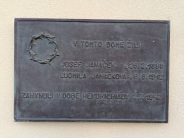 Jedná se o litou bronzovou desku osazenou na fasádě domu v Havlíčkově ul. č.p. 1842. Deska nese nápis: "V tomto domě žili/Josef Janáček *26.2.1898/ Ludmila Janáčková *6.8.1912/zahynuli v době heydrichiády 2.7.1942." Autorem výtvarného návrhu byl Stanislav Remeš, odlil ji Jiří Píša (1970). JOSEF JANÁČEK (* 26.2.1898) byl odborný učitel a funkcionář Československé sociálně demokratické strany dělnické v Pardubicích, jeho žena Ludmila, roz. Nováčková (nar. 1912) byla herečkou Východočeského divadla. Již od března 1939 byl Josef Janáček zapojen do odbojové činnosti, v prosinci 1941 po seskoku pomáhal Josefu Valčíkovi, členovi skupiny Silver A. U Janáčků v bytě byla načas uschována i radiostanice Libuše. Odvaha a obětavost manželů Janáčkových pro ně měla po atentátu na Heydricha v květnu 1942 fatální důsledky. Janáčkovi byli zatčeni 20. června 1942 a poté vězněni v pardubické donucovací pracovně. Oba byli popraveni nacisty společně s dalšími účastníky odboje na Zámečku 2. července 1942.