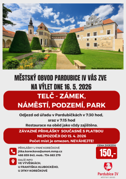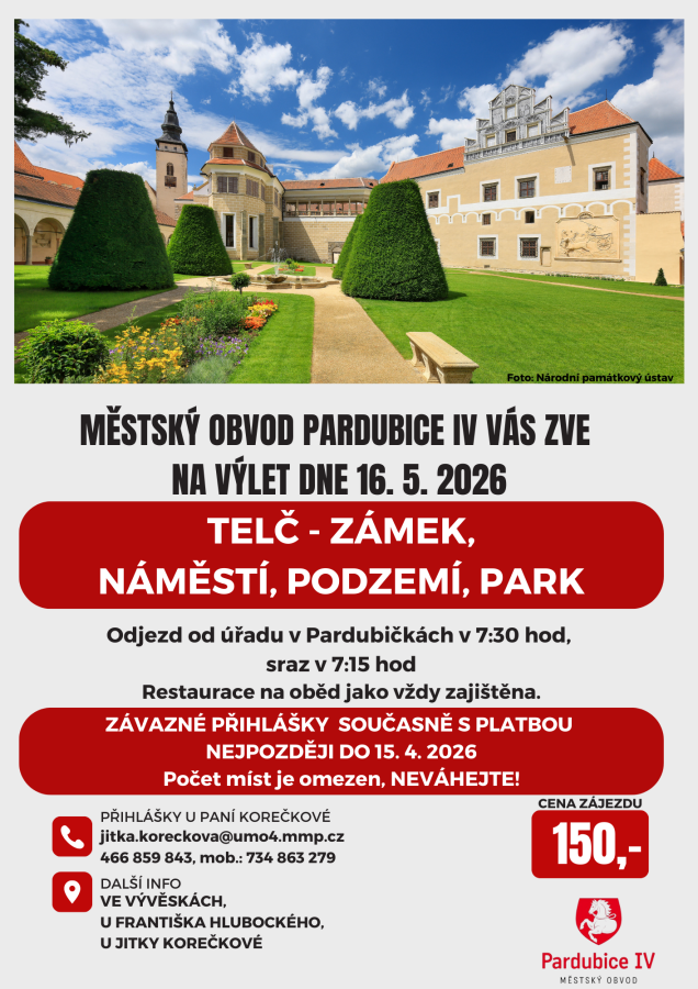 Aktuality Pozvánka na výlet 16. 5. 2026 Městský obvod Pardubice IV vás zve na výlet konaný dne 16. 5. 2026 do Telče. Podrobnosti v přiloženém letáku. Přihlášky u paní Jitky Korečkové: jitka.koreckova@umo4.mmp.cz 466 859 843, mobil : 734 863 279 Těšíme se na vaši účast. Fotogalerie