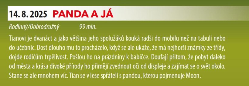 Aktuality PRÁZDNINOVÉ KINO NA DUBINĚ - ČTVRTEK 14. 8. 2025 PANDA A JÁ / promítání v srpnu od 21.00 hodin