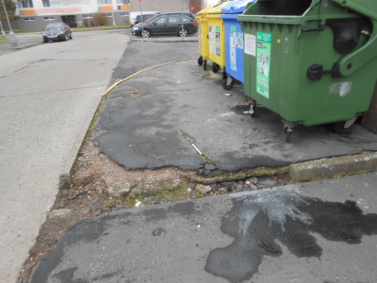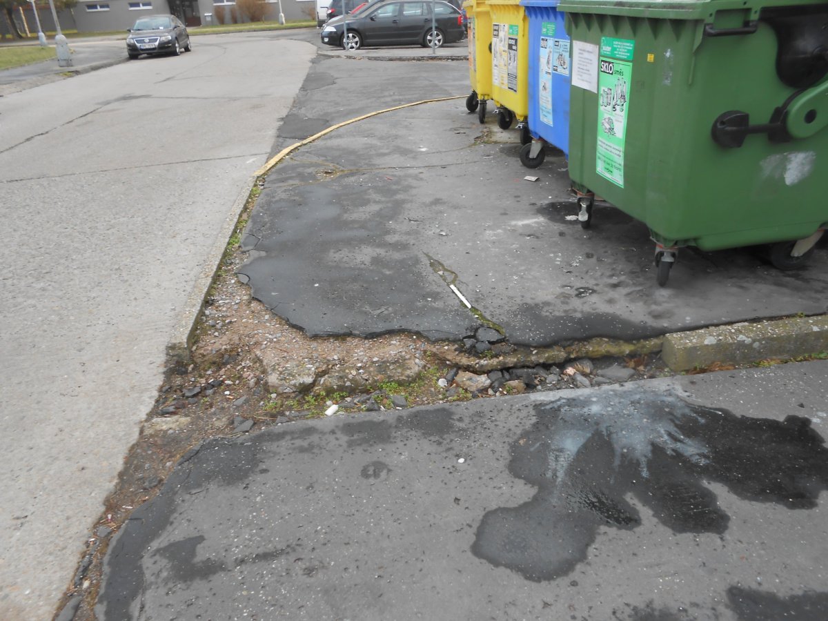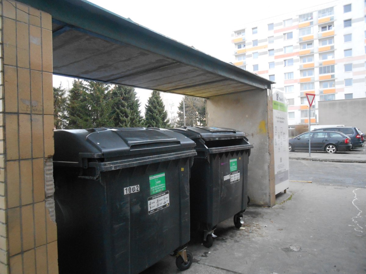 Jedná se opravu již nevyhovujícího kontejnerového stání. Je navrženo osazení 2 ks nových konstrukcí kontejnerového stání se zastřešením, spolu se zpevněnými dlážděnými plochami. Jde o nově zřizované kontejnerové stání, vydlážděné, obehnané zděnými stěnami a zastřešené ocelovou konstrukcí s trapézovým plechem. Zděný přístřešek je navržen o velikosti půdorysné plochy 4,59 x 5,38 m pro 6 ks pojízdných kontejnerů o objemu 1100 l – kontejnerová stání jsou navržena ve stejném provedení jako stání v okolí. Zdi přístřešku jsou ze systému univerzálních zdících prvků z pohledových stran s imitací přírodního kamene (štípané pohledové strany). Barva přírodní výšky 1,50 m. Střecha je navržena z ocelové příhradové konstrukce s krytinou z trapézového plechu barvy přírodní. Stání bude vydlážděno zámkovou dlažbou šedé barvy a ohraničeno zdmi. Stání má půdorysný tvar obdélníku s příjezdovým chodníkem o šířce 1,50 m. Stání je výškově navázáno na přilehlé plochy a vyspádováno směrem ke vchodovým částem. Stání má navrženo min. příčná sklon 0,5 % - max. 2,5 %. Stání je navrženo jako průchozí. Odvodnění je navrženo na komunikaci.
