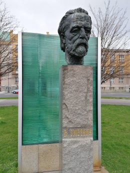 Skleněná výtvarná stěna s bustou Bedřicha Smetany