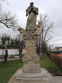 Socha představuje zakladatele řádu paulánů sv. Františka z Pauly (1416-1507), kalábrijského mladíka, který se oddal poustevnickému životu. Založil řeholní komunitu paulánů, působící i v Čechách. Socha vznikla v dílně pardubického sochaře Jakuba Teplého (1729 1802) kolem roku 1765 jako protějšek sochy sv. Jana Nepomuckého. Je zhotovena z pískovce z lomu ve Škrovádu u Slatiňan. Na současném místě je socha od roku 1805, kdy zemní val s kamenným mostkem nahradil původní dřevěný most přes vodní příkop, na němž původně stála. Roku 2005 byla socha restaurována. Základnu sochy tvoří kvadratická základna s vydutou čelní stěnou, na níž spočívá vysoký volutový sokl. Boční stěny soklu jsou pojednány v mělkém reliéfu, na čelní straně a korunní římse je naopak reliéf vysoký a hluboce prořezávaný. Pojetím i ornamentikou se blíží Teplého dřevořezbám. Sokl završuje nízký podstavec s rokajovým ornamentem, na němž stojí světcova postava. Po stranáchjej doprovází dvojice puttů na oblacích. Putto po světcově levici nese oválnou kartuši s nápisem CHARITAS, láska, který je světcovým atributem. František z Pauly je vyobrazen v souladu s tradicí jako starší muž s plnovousem ve františkánském odění. Stojí v mírném kontrapostu s váhou na levé noze, se sepjatýma rukama na hrudi a s hlavou obrácenou k nebesům v extatické modlitbě. Přes jistou schematičnost postoje světce patří socha k nejlepším Teplého pracím.