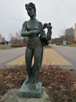 Volná figurální plastika akademického sochaře Břetislava Bendy byla v minulosti několikrát stěhována a osud plastiky žáka J. V Myslbeka byl velmi komplikovaný. Bronzovou sochu s názvem Vítězství věnoval městu Pardubice sám autor Břetislav Benda, následně ji město v roce 1968 nechalo umístit na náměstí Československých legií. V roce 1998 byla socha z důvodu revitalizace parku přemístěna před pardubický plavecký areál, kde stála až do roku 2010. Z důvodu rozsáhlé rekonstrukce areálu ji muselo město odstranit a dočasně umístit v jenom ze svých skladů. V roce 2014 o sochu projevil zájem potápěčský klub a chtěl plastiku umístit na dno zatopeného lomu jako atrakci. Zastupitelé města převod sochy odsouhlasili, ale záhy se vůči tomuto kroku kriticky ohradila odborná veřejnost a rodina Břetislava Bendy. Převod plastiky byl zastaven a zastupitelstvo rozhodlo o nové lokalitě plastiky. Socha Vítězství je nyní součástí hlavní dubinské promenády. Formální styl sochy odpovídá osobnímu stylu Břetislava Bendy, který téměř celý život zůstal věrný neoklasicistním formám. Socha Vítězství nese několik zástupných atributů, které odkazují k podstatě jejího názvu, palmovou ratolest, sochu slavné bohyně vítězství Niké Samothrácké a vavřínový věnec.