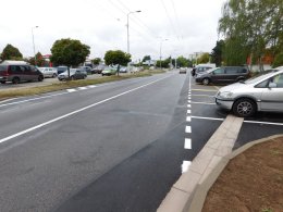 Šířka komunikace mezi obrubami zůstala stávající, pouze byl její prostor vymezen vodorovným dopravním značením. Příčné uspořádání je následující: směrem k pergole zleva pás š. 1,60 m – pouze vodorovné DZ čára V4, 2x 3,50 m jízdní pruh, kolmé stání š. resp. dl. stání 4,75m (zůstávají stávající). V celém úseku je nově provedena středová čára. V úseku 50 m ve směru od přechodu k pergole byla navržena V1a, při výjezdu z parkoviště u supermarketu Albert doplněna čarou V2b 3/1,5/0,125 a za výjezdem z Alberta je dále v návaznosti pouze středová čára V2a (3/6/0,125). Dále byl upraven směrový oblouk v křižovatce na výjezdu z komunikace od centrálního parkoviště. Oblouk byl upraven tak, aby v rozhledovém poli auta napojující se na hlavní nebyla umístěna kolmá parkovací stání při výhledu vlevo, jak tomu bylo v původním stavu. Zároveň bylo při umístění obruby respektováno odvodnění do stávající uliční vpusti.