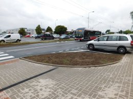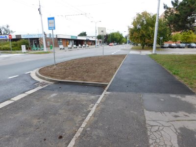v = 50 km/h. Vysazené plochy jsou ohraničené silniční obrubou s podsádkou +12 cm, vnitřky ploch ohumusovány a ozeleněny. Kolmá stání v bezprostřední blízkosti přechodu jsou upravena tak, aby byly zajištěny rozhledové poměry na přechodu. Umístěním vysazené plochy došlo ke zrušení 2 nejbližších stání u přechodu a dále až ke kontejnerovým přístřeškům byla vodorovnými čarami V10b vyznačena 3 kolmá stání pro O1 o rozměrech 2,50 x 4,75 m; v délce 4,30 m před kontejnerovým přístřeškem pak je vodorovné DZ V12a Žlutá klikatá čára.