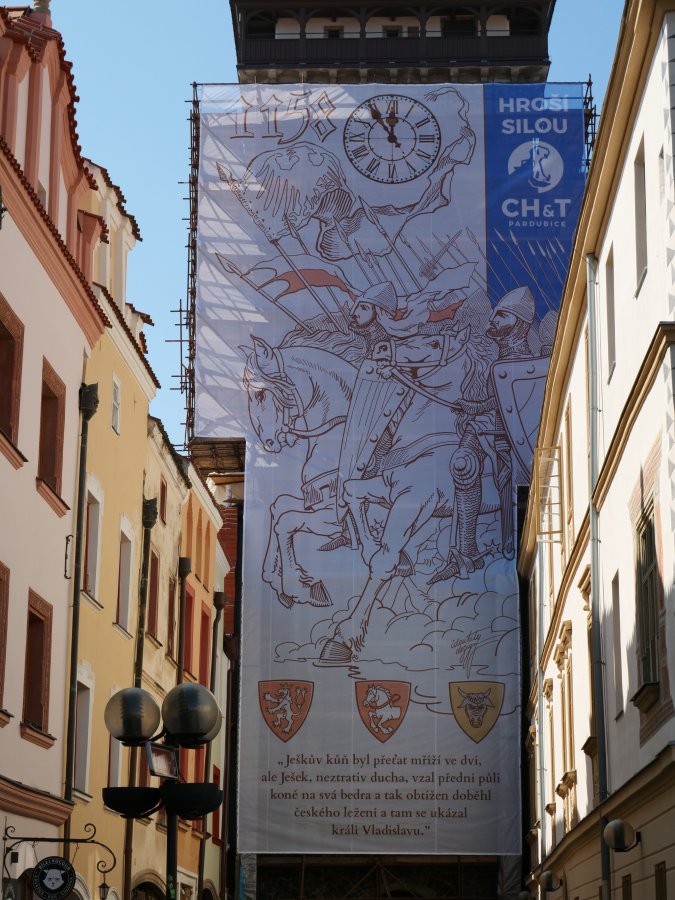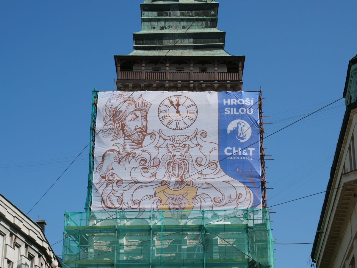 Součástí rekonstrukce je i unikátní zakrytí věže, které tvoří originální ruční perokresba ve stylu Mikoláše Alše, autora návrhu reliéfu na Zelené bráně z roku 1903. Tato koláž, která překrývá lešení, zobrazuje legendu o vzniku městského erbu, erb rodu Pernštejnů a podobiznu Viléma z Pernštejna, významného muže spojeného s rozvojem města. Zadní strana kresby, viditelná z Pernštýnského náměstí, odkazuje na osudový rok 1158 a bitvu u Milána, která měla zásadní význam pro českou historii.