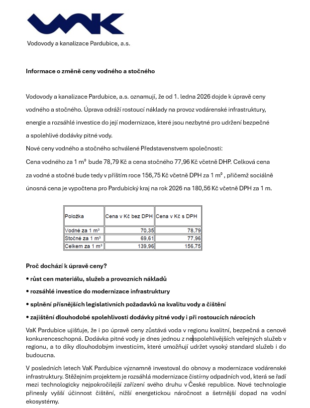 Vodovody a kanalizace Pardubice, a.s. oznamují, že od 1. ledna 2026 dojde k úpravě ceny